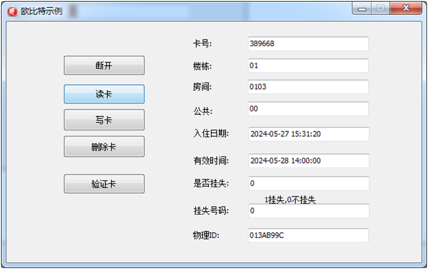 __int16 __stdcall dv_read_card(unsigned char* cardno,unsigned har* building,unsigned char* room, unsigned char* commdoors, unsigned char* arrival, unsigned char* departure,unsigned char* cardID);